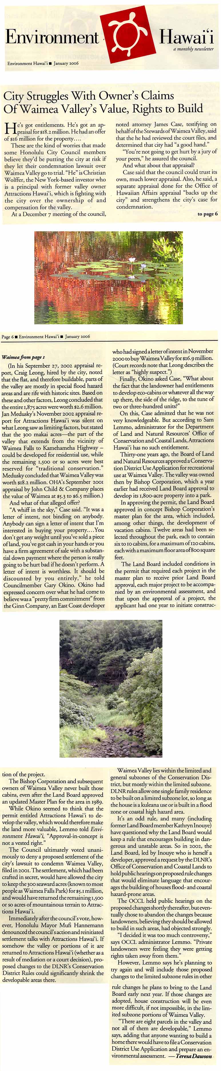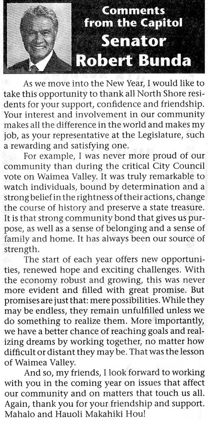 "...I was never more proud of our community than during the critical City Council vote on Waimea Valley. It was truly remarkable to watch individuals, bound by determination and a strong belief in the rightness of their actions, change the course of history and preserve a state treasure."