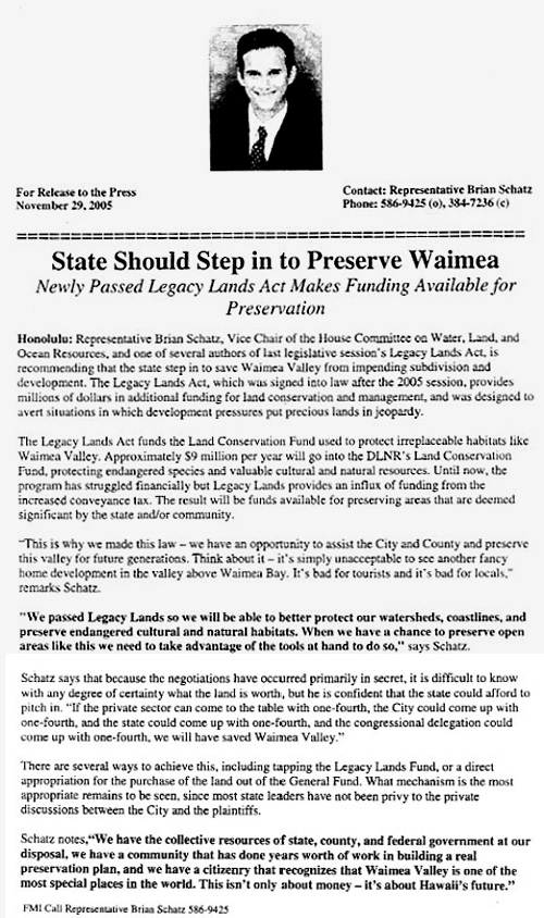 For example, the recently passed Legacy Lands Act makes state money available for preservation. According to Representative Brian Schatz, the Legacy Lands Act "provides millions of dollars in additional funding for land conservation and management. It was designed to avert situations in which development pressures put precious lands in jeopardy." This offers a strong ray of hope. It is worth going to court to determine the fair market value of Waimea Valley.