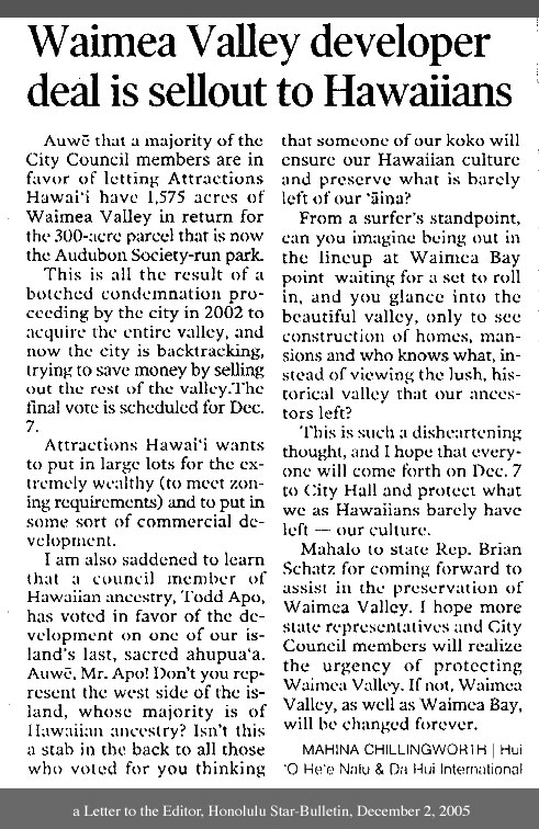 I am saddened that the Mayor seems to be letting you, the Honorable Councilmembers, take all the heat and public responsibilty for such an important issue, while he remains silently on the sidelines. Being that the holidays are upon us, and a court date of Feb 13, 2006 looming, I can also understand that the attorney's with the Corp Council are also encouraging you to take the easy way out and "settle" out of court. It will take more time and effort on their part to go to court. However, that is exactly where this should be directed. The court is the "best" and most "open" way to represent the public interest and honor the City's promise to the community to keep the sacred land of Waimea Valley intact according to the Master Plan.