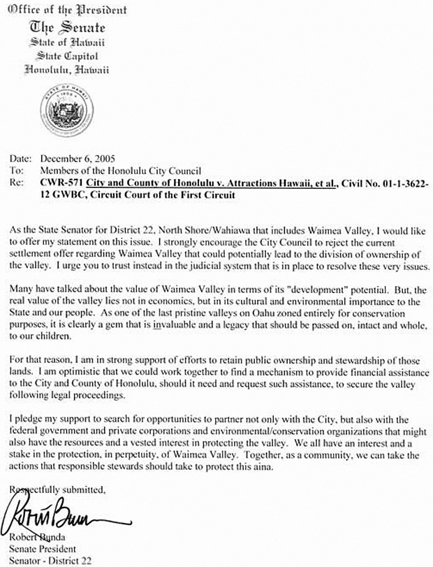 More than five years ago we submitted testimony to the Council regarding Resolution 00-176, authorizing the mayor to enter into negotiations to acquire and preserve Waimea Valley for the people of Hawai'i. At that time we stated, Rarely are we presented with such an opportunity to preserve a legacy for future generations. The unique natural, cultural and historic resources in Waimea Valley must be protected through responsible public stewardship. The Council is presented with the same opportunity today. You must not allow your duty to the people of this island to be derailed by a misguided behind-closed-doors strategy that treats the public as if it is incapable of understanding the issuesand precludes us from working with you to devise a solution.